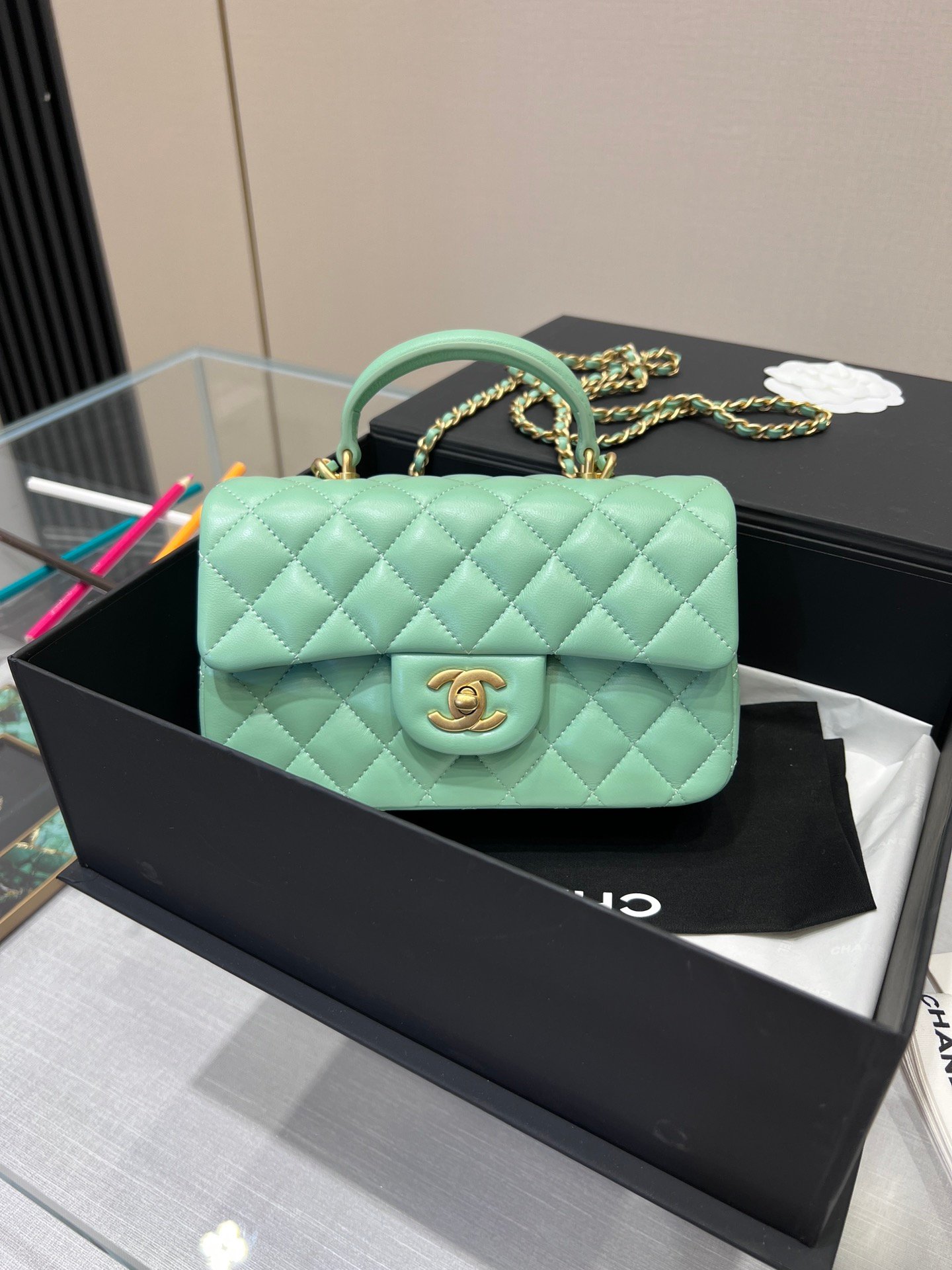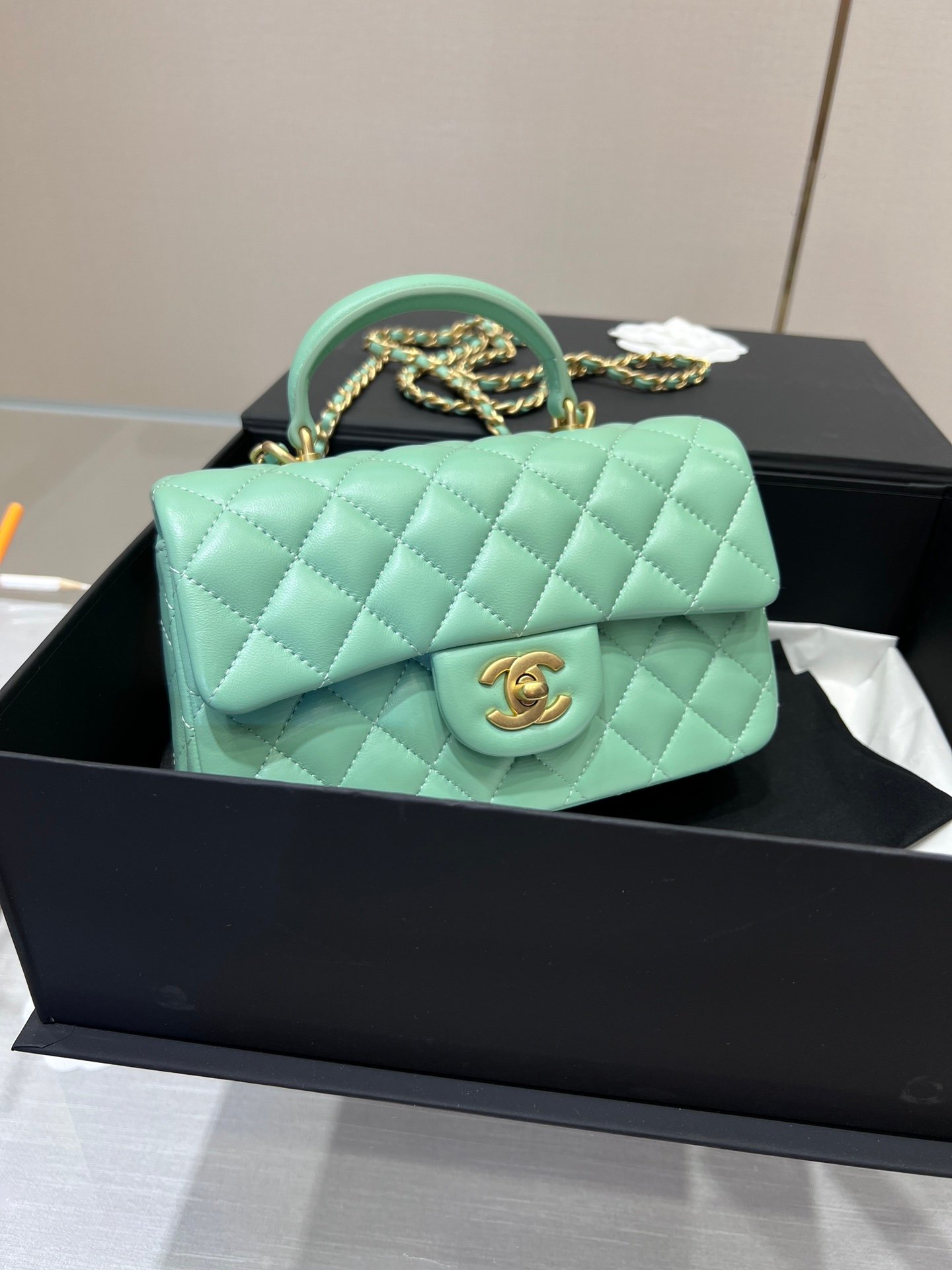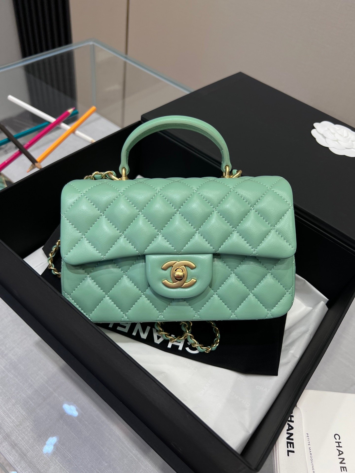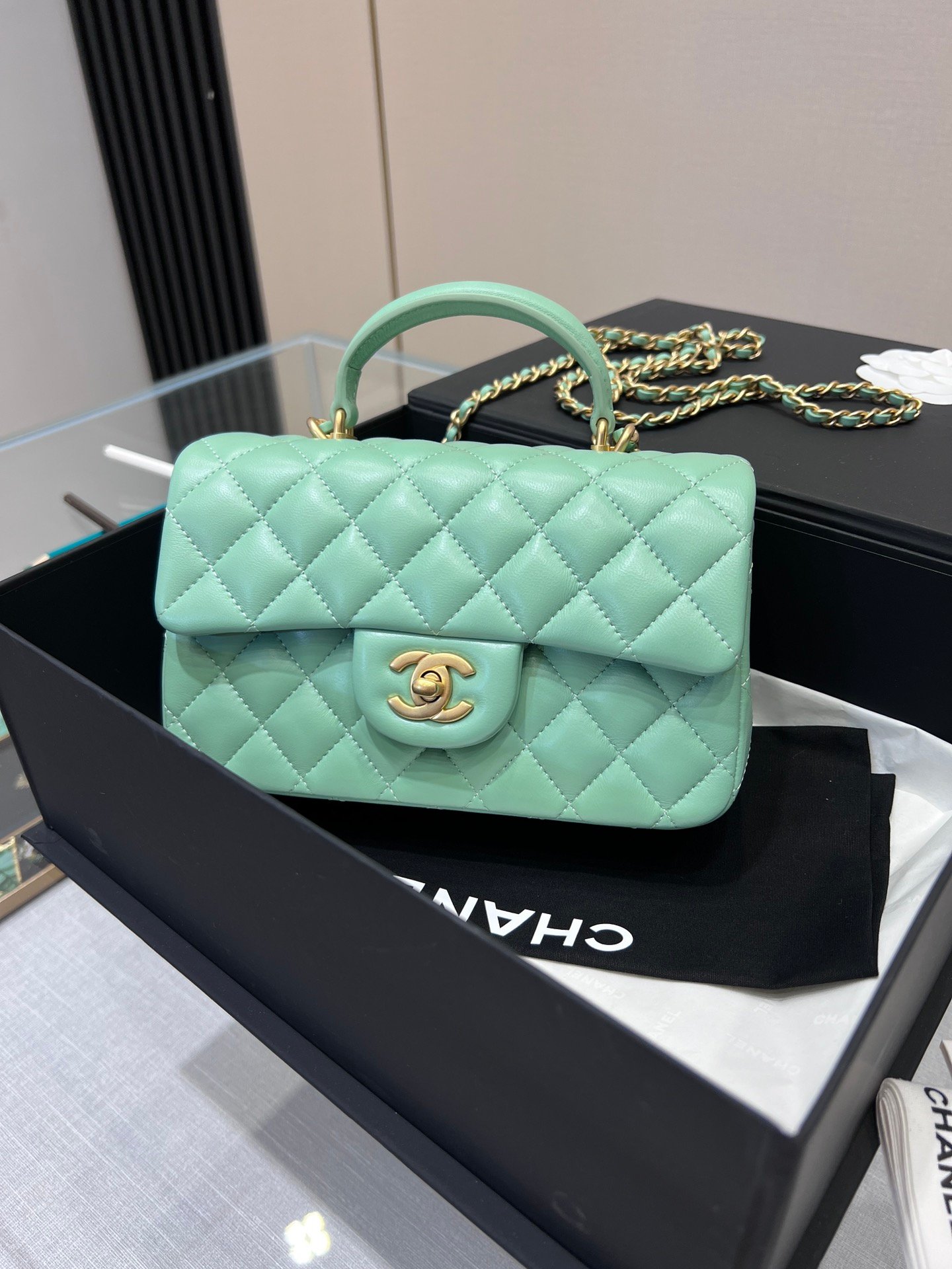 Chanel Classic Flap Mini Top Handle – Light Emerald Green GHW – 20cm – AS2431